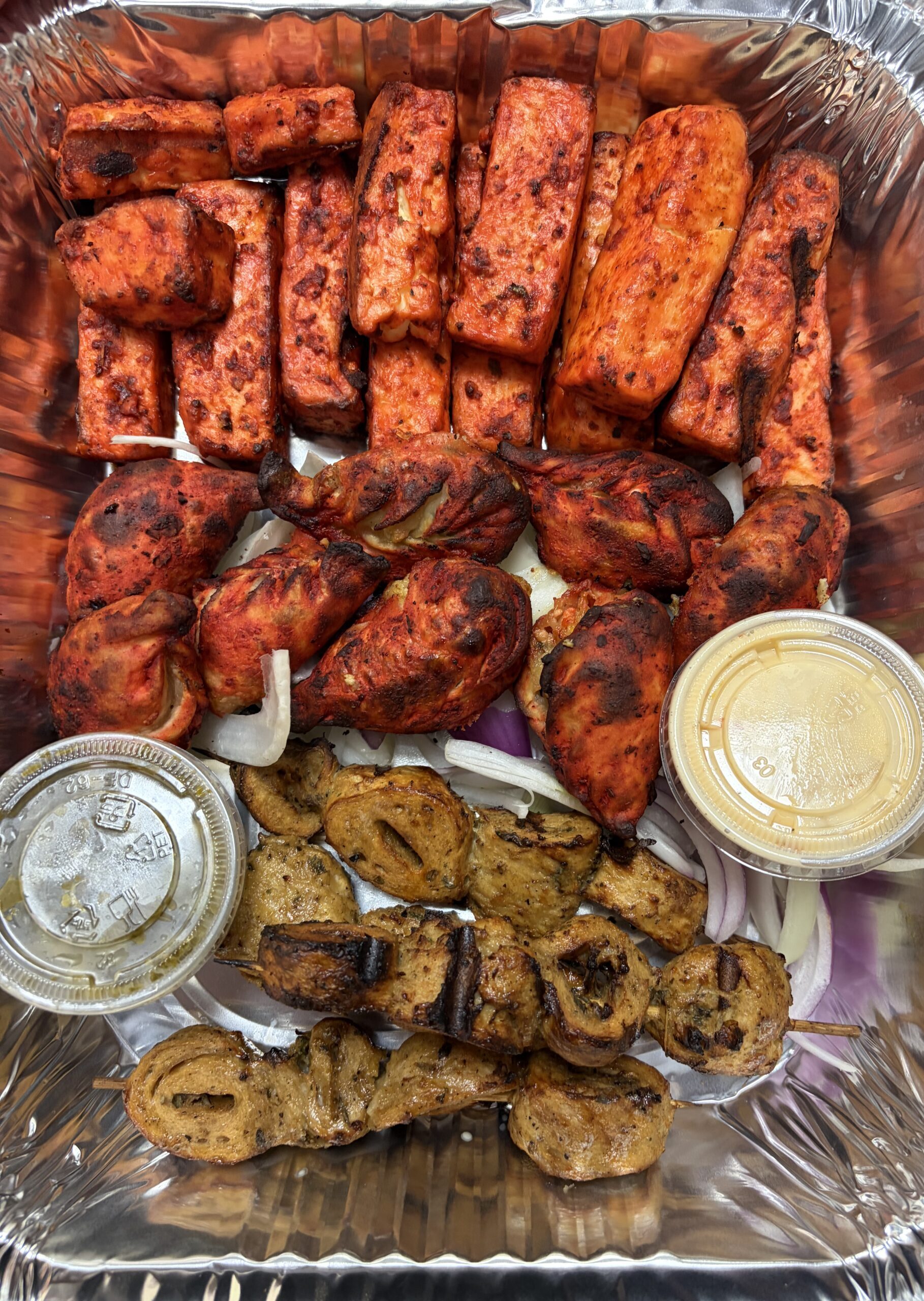 A delicious treat for vegetarian food lovers! The Sunstone Veggie Platter features 8 grilled momos, 1lb of crispy buffalo paneer fingers, and  3pcs soya chap skewers. Grilled to perfection and seasoned with rich spices, this platter brings together the best of plant-based indulgence—perfect for sharing or savoring solo.